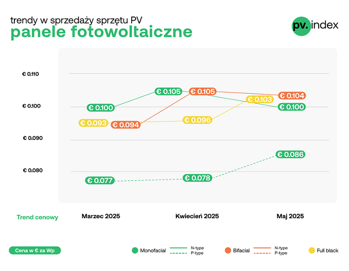 Wyraźniejszy wzrost widać w ostatnich tygodniach, jeśli chodzi o ceny modułów dwustronnych i modułów typu full black: z około 0,09 euro/Wp na początku roku do ponad 0,1 euro/Wp w maju.
