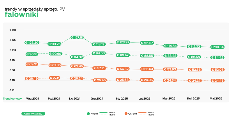 Falowniki hybrydowe, stosowane w instalacjach łączących produkcję i magazynowanie energii, w kategorii zarówno urządzeń o jednostkowej mocy do, jak i powyżej 15 kW, potaniały w zeszłym miesiącu o 2%. Zdaniem analityków sun.store wynika to z silnej konkurencji i dostępności zapasów.