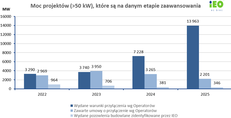 Na podstawie zebranych informacji IEO wnioskuje, że polski rynek projektów fotowoltaicznych w dalszym ciągu rozwija się bardzo szybko – w szczególności, jeśli chodzi o moce projektów z wydanymi warunkami przyłączeniowymi i pozwoleniami na budowę.